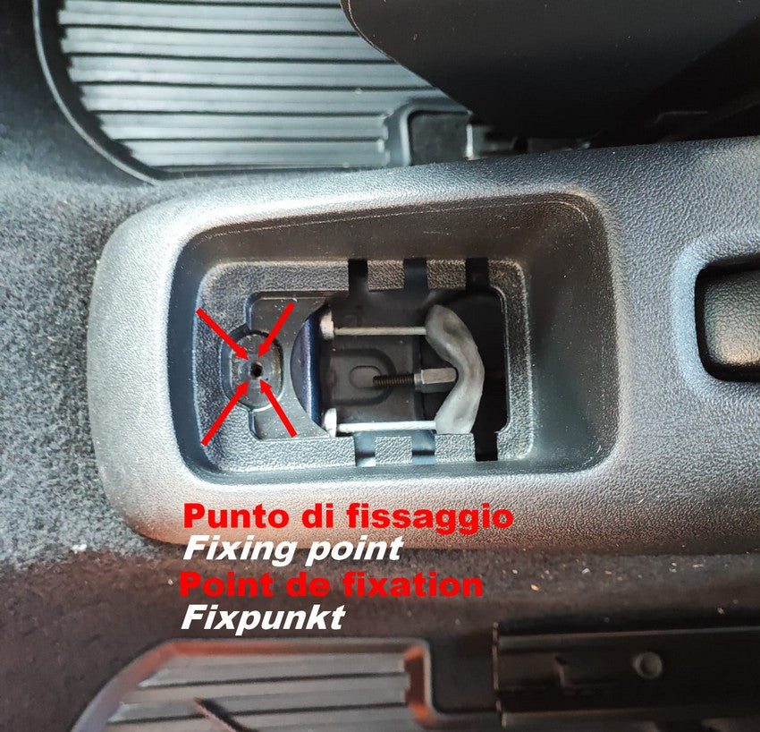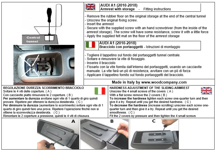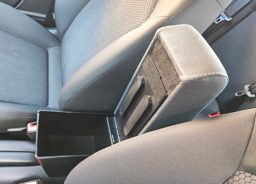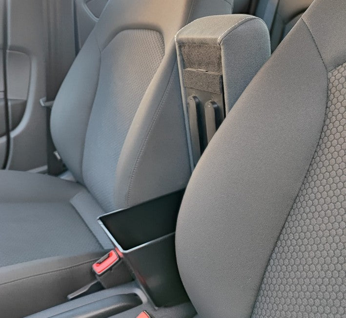 Length-adjustable armrest specifically for Audi A1 (2010-2018) with installation in “ORIGINAL POINTS” (using fixing points already present on the central tunnel, avoiding damaging it by drilling new holes.