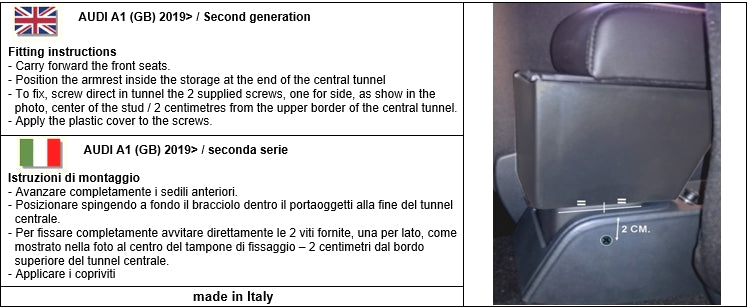 This product is designed and manufactured specifically for this car model; it is not a universal armrest. It is entirely made in Italy by expert craftsmen, using only high-quality materials.