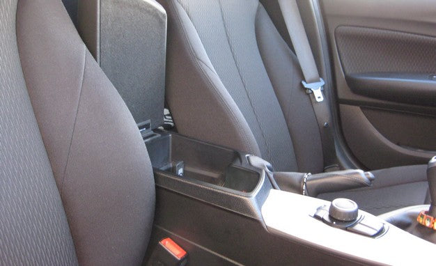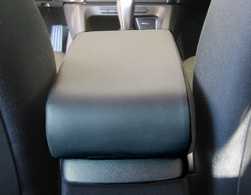 The armrest lifts up (folds backwards) allowing access to the original storage compartment on the car's central tunnel.