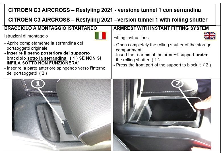 Specific armrest for Citroen C3 Aicross (2021-2024) central tunnel version WITH shutter, with “PLUG-IN” interlocking installation (without screws, avoiding damaging the car by drilling holes). Characteristics: IT IS INSTALLED ONLY ON CENTRAL TUNNEL WITH SHUTTER (see photo in the image gallery)