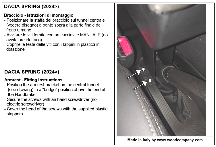 This product is designed and manufactured specifically for this car model; it is not a universal armrest. It is entirely made in Italy by expert craftsmen, using only high-quality materials.