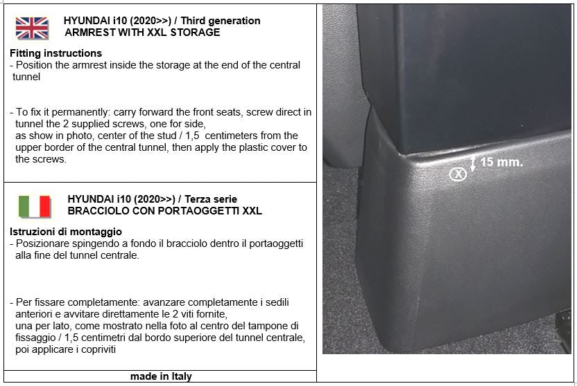 This product is designed and manufactured specifically for this car model; it is not a universal armrest. It is entirely made in Italy by expert craftsmen, using only high-quality materials.