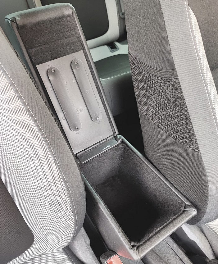 Length-adjustable armrest model PREMIUM specific for Skoda Fabia 3 (2014-2021) with installation in “ORIGINAL POINTS” (using fixing points already present on the central tunnel, avoiding damaging it by drilling new holes.
