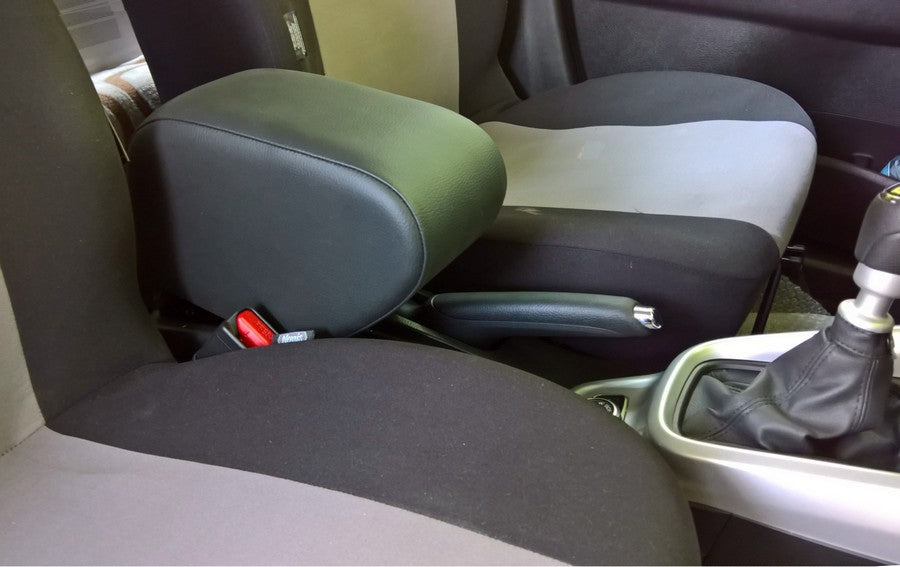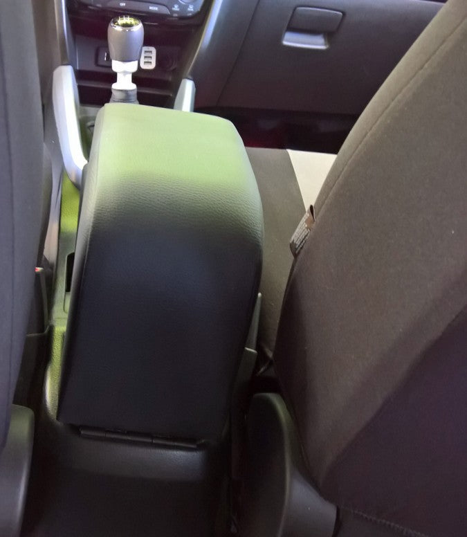 The armrest lifts up (flips up) allowing access to the original storage compartment present on the central tunnel of the car.