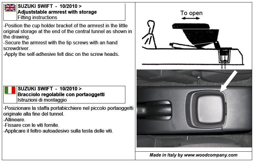This product is designed and manufactured specifically for this car model; it is not a universal armrest. It is entirely made in Italy by expert craftsmen, using only high-quality materials.