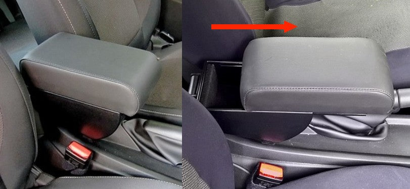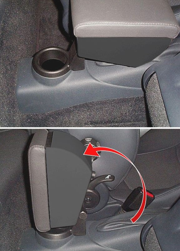 Length-adjustable and foldable armrest for Mini F56 (2014>) with 3 doors and F57. Equipped with a spacious storage compartment and a soft pad. Sliding the pad forward reveals the storage compartment underneath (see photo in the gallery).